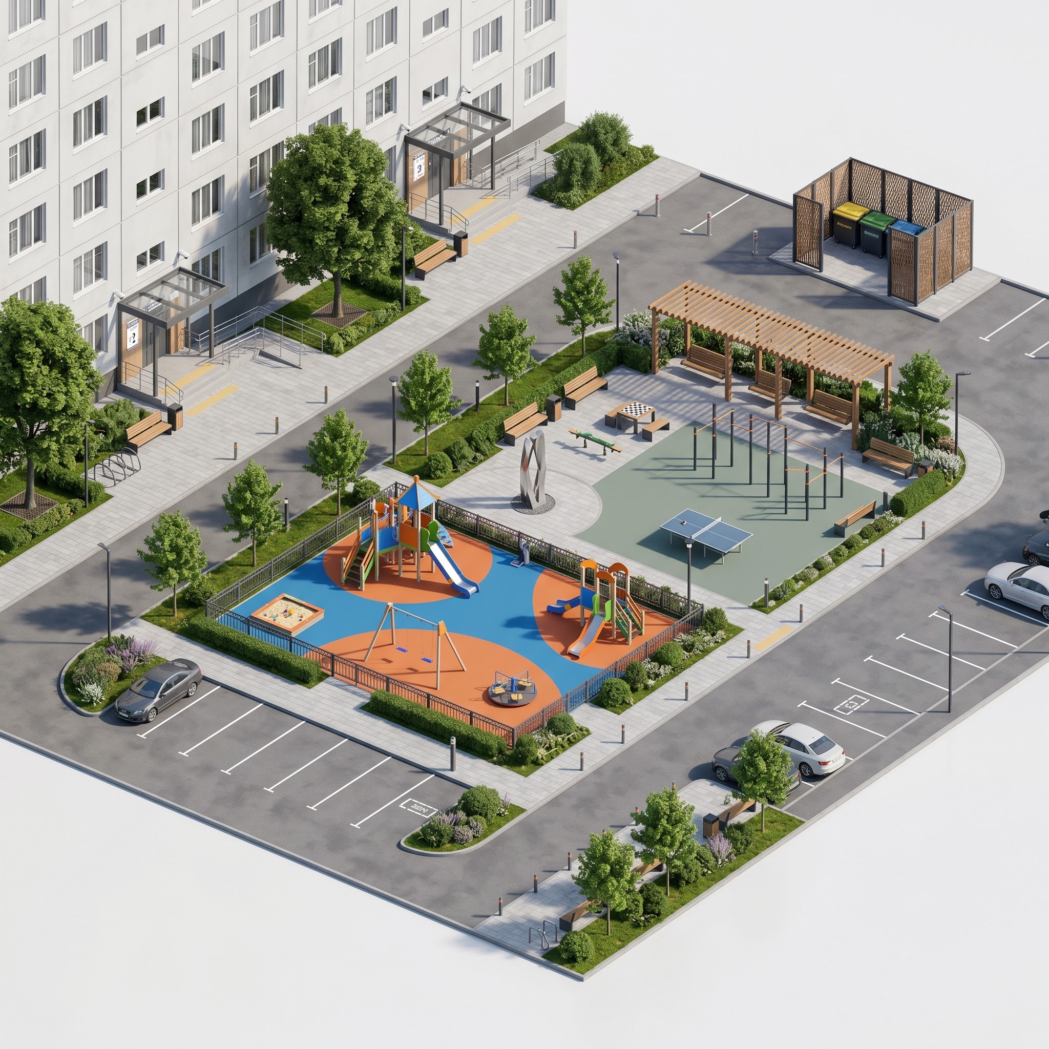Дворы хрущёвок советской застройки изначально решали один сценарий — сквозной проход к подъезду и стихийную парковку. Скамейка у входа, пара деревьев и асфальт по всей территории. С появлением машин и ростом плотности жильцов двор перестал работать: дети играли среди припаркованных автомобилей, подросткам было негде заняться спортом, пожилые жители теряли пространство для общения. Реновация — момент, когда двор можно перепрошить под современные сценарии, не увеличивая его площадь. Проект разводит функции по принципу «своё место для каждого возраста». В центре двора — огороженная детская площадка с резиновым покрытием, игровым комплексом для младших, качелями, песочницей и каруселью; ограждение и зелёный буфер отделяют её от парковки. Рядом, но на отдельном покрытии — воркаут-зона с турниками и брусьями, стол для настольного тенниса и шахматный стол: подростки и активные взрослые получают свою территорию. Тихая рекреация под перголой со скамьями и арт-объектом обслуживает старшее поколение и родителей с колясками — отсюда виден детский комплекс. Подъезды оборудованы пандусами и козырьками, велопарковкой у входа. Хозяйственная функция — контейнеры ТКО — вынесена в дальний угол и закрыта деревянным экраном, чтобы не портить вид и не давать запаха в окна. Парковка организована по периметру и не пересекает пешеходные маршруты. В результате жильцы получают двор, в котором семья с ребёнком, подросток, пенсионер и владелец автомобиля пользуются территорией одновременно, не конфликтуя за пространство. Двор перестаёт быть транзитным асфальтом и становится местом, где соседи встречаются и проводят время — не уезжая в парк и не выходя за пределы своего дома.