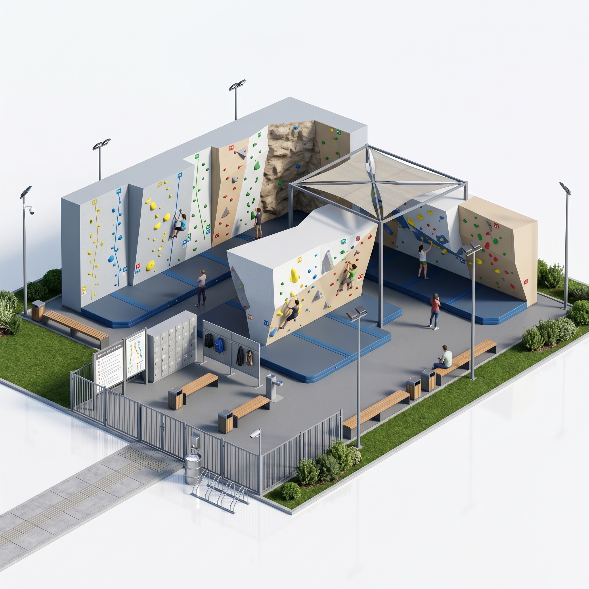 Площадка организована как компактный болдеринговый комплекс открытого типа с несколькими типами тренировочных стен: вертикальные щиты с накладными зацепами, имитация природного скального рельефа, нависающие секции и отдельно стоящий объёмный болдер. Покрытие под стенами выполнено из ударопоглощающих матов синего цвета.