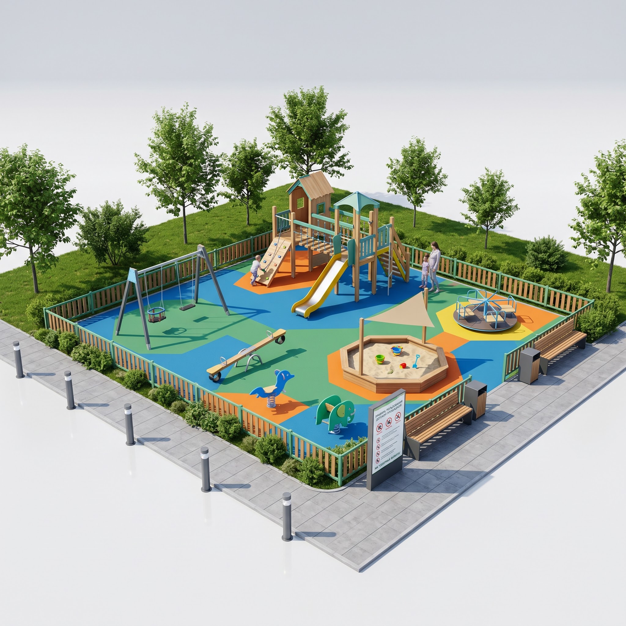 Площадка собрана как замкнутый дворовой объект: огороженный периметр с одним входом со стороны тротуара исключает попадание детей на проезды и одновременно даёт родителям полный обзор территории со скамей у входа. Игровое оборудование разнесено по функциям — комплекс с горкой и скалодромом для активной игры, песочница под навесом для спокойных занятий, качалки на пружинах для самых младших. Резиновое покрытие с цветным зонированием задаёт безопасные траектории движения между снарядами и снижает риск травм при падении.