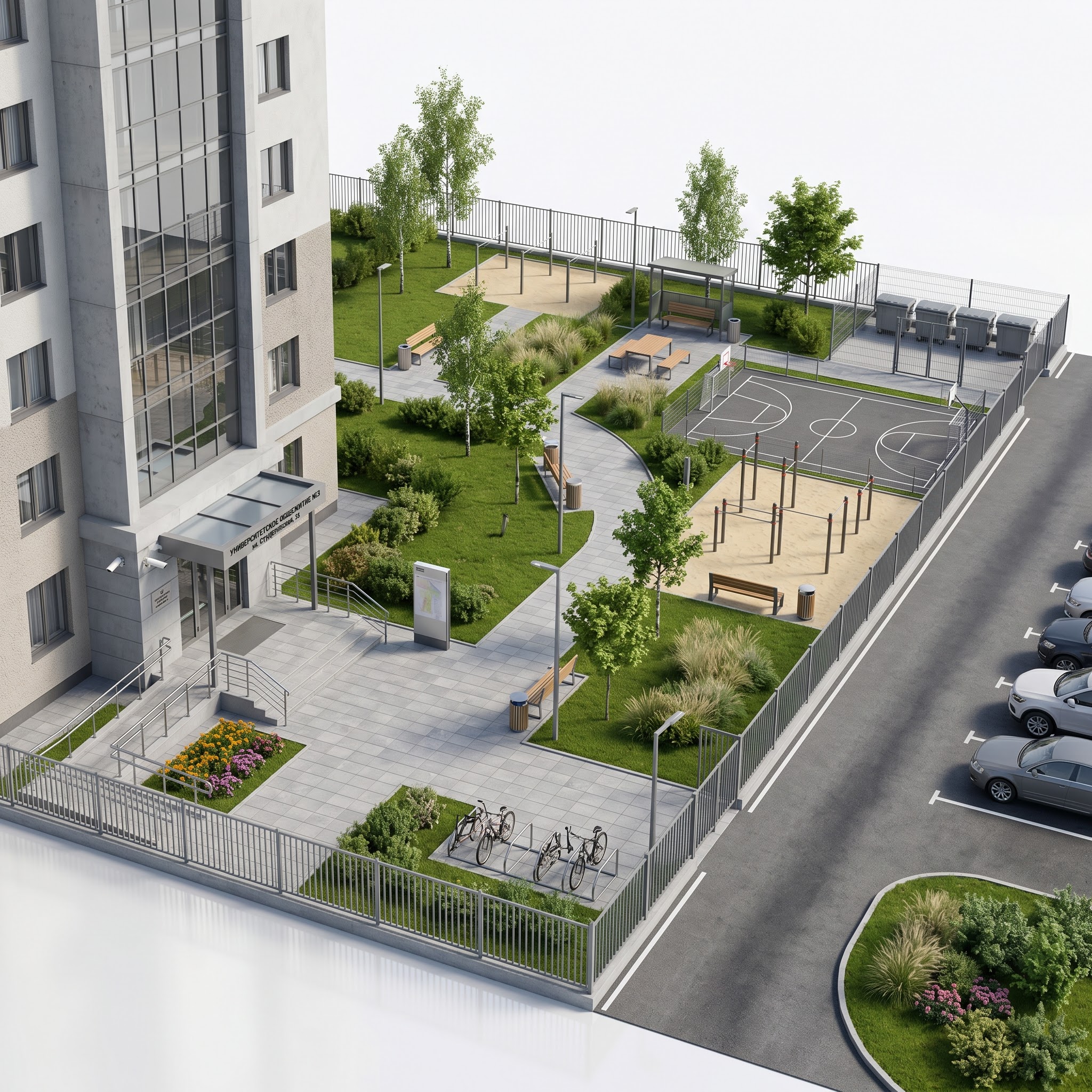 Двор общежития — это территория, которая в большинстве случаев работает по остаточному принципу: газон, пара лавок и контейнерная площадка. При этом студенты живут в общежитии практически круглый год, проводят там не только ночёвку, но и значительную часть бытовой жизни — приём пищи, общение, занятия спортом, велосипедные перемещения. Внутри здания эти сценарии конкурируют за коридоры, кухни и комнаты. Когда двор не закрывает повседневные сценарии, студенты выносят их на парковку, на улицу за ограждением или просто отказываются от них. Проект решает задачу через явное разделение двора на функциональные блоки, каждый из которых закрывает свой сценарий. Спортивная зона у дальнего ограждения объединяет воркаут на песчаном основании и универсальную игровую площадку для баскетбола и мини-футбола — это блок физической активности, к которому можно выйти в перерыве между парами. Центральный участок с обеденным столом, навесом и лавками работает как зона совместного приёма пищи и общения на воздухе — это разгружает кухни общежития летом. Входная группа с велопарковкой, навигационным стендом и освещением формирует точку прибытия и отбытия, а хозяйственная зона с контейнерами вынесена за пределы прогулочных маршрутов и закрыта ограждением. Зелёные участки между блоками работают визуальными и шумовыми буферами. В итоге студент получает двор, на котором умещается базовый набор повседневных дел: размяться, поесть с соседями по комнате, оставить велосипед, встретиться у входа. Администрации общежития это даёт упорядоченную территорию без стихийных зон и снижает нагрузку на внутренние помещения здания в тёплое время года.