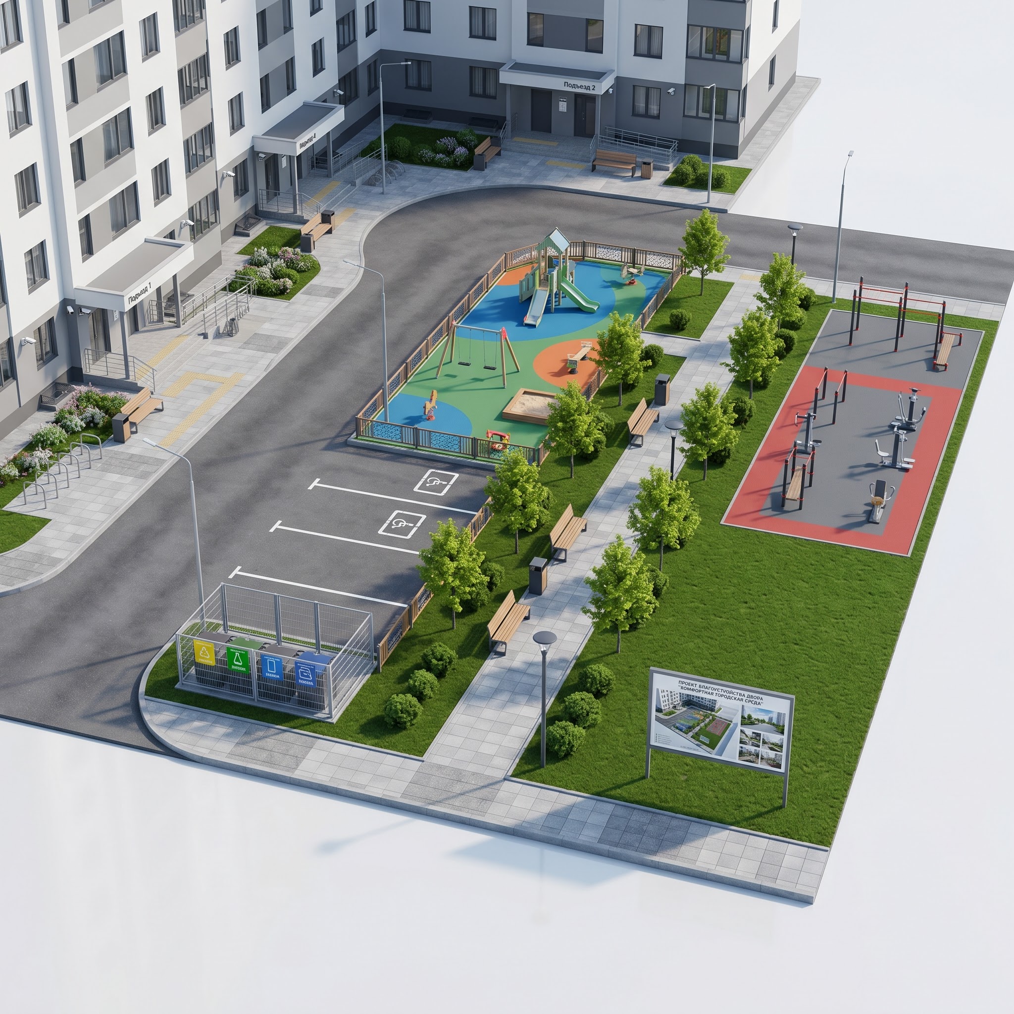 Решение разводит детей, активных взрослых и хозяйственные процессы в три независимых сценария. Огороженная детская площадка вынесена от проезда и просматривается из окон обоих подъездов. Воркаут и тренажёры размещены в отдельном спортивном пятне на восточной стороне — шум от занятий не мешает игре младших и отдыху на лавках бульвара. Контейнерная площадка с раздельным сбором отнесена к границе участка, чтобы маршрут вывоза мусора не пересекался с детскими и пешеходными потоками. Парадные подъезды получили пандусы, навесы и велопарковки.