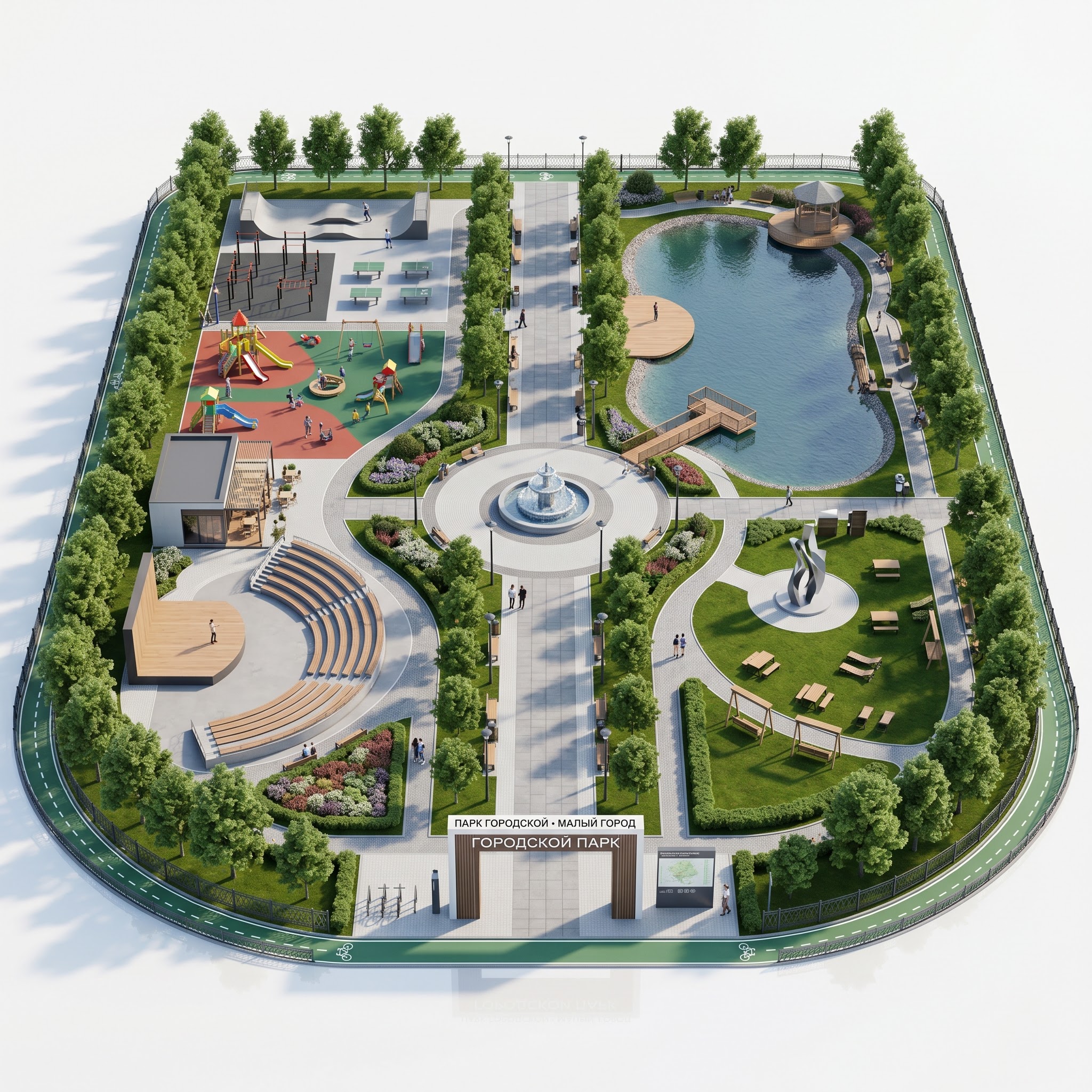 Городской парк с центральной площадью, прудом, амфитеатром и спортивным кластером
