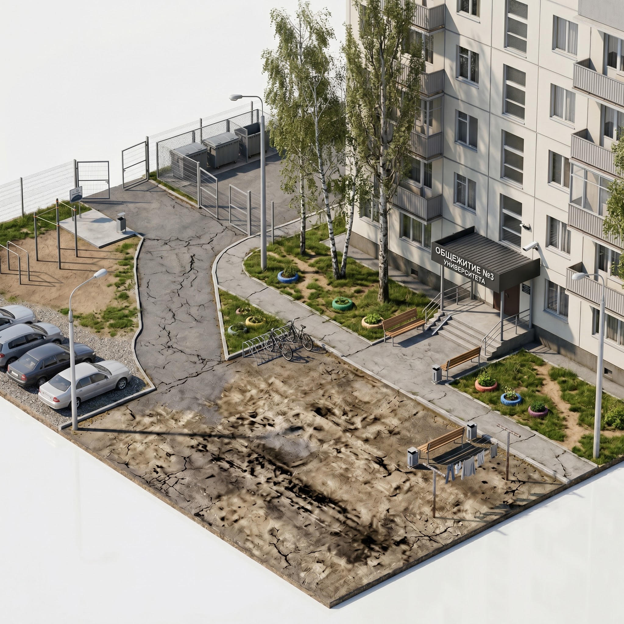 Проект охватывает придомовую территорию студенческого общежития №3 университета. Решение построено по принципу разумной экономии: на ограниченной площади размещён базовый набор функций, необходимых для повседневной жизни студентов в общежитии — парковка автомобилей, велопарковка у входа, входная группа со скамьями, хозяйственная зона с площадкой для сушки белья, площадка для контейнерного мусоросборника и небольшая спортивная зона с турниками. Входная группа примыкает к крыльцу общежития: установлены скамьи и используются цветники в декоративных шинах — типовое решение для бюджетного двора. Пешеходная связь от входа выводит к велопарковке, далее к асфальтовой дорожке, ведущей к спортивной площадке у дальней границы участка и к контейнерной площадке с сетчатым ограждением. Хозяйственный блок с сушилками для белья вынесен в отдельную зону на грунтовом покрытии и обслуживает бытовые нужды проживающих. Парковка вдоль западной границы рассчитана на легковые автомобили сотрудников и студентов и выполнена в гравийном исполнении. Проект сознательно удерживает минимальный бюджет: используются простые материалы, базовые МАФ и существующее озеленение из берёз. Такое решение подходит для университетов с ограниченным финансированием, когда необходимо закрыть базовые функции придомовой территории общежития без капитальных вложений в дорогостоящие покрытия и оборудование.