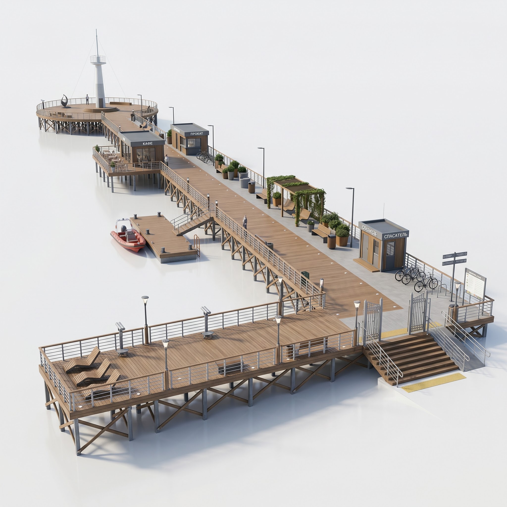 Городские набережные часто заканчиваются у уреза воды: житель видит акваторию, но не выходит к ней. Доступ к самой воде остаётся за судовладельцами, рыбаками и техническими службами, а массовый посетитель остаётся на сухом берегу за ограждением. Прогулочная функция и сервисная инфраструктура — кафе, прокат, точки отдыха — концентрируются в глубине набережной, и контакт с водой ограничивается визуальным. Этот проект решает задачу иначе: пирс становится продолжением общественного пространства над акваторией. Парадная лестница с пандусом и тактильной плиткой выводит посетителя с берега на нижнюю террасу с шезлонгами и видовыми биноклями — здесь работает сценарий созерцания. Дальше главная палуба ведёт к сервисному узлу: кафе с летней террасой, павильон проката велосипедов с парковкой, пост спасателя с прямой видимостью на акваторию. Боковой трап спускается на плавучий понтон, где швартуются маломерные суда — швартовочный поток отделён от пешеходного. В средней части променада стоит теневая пергола с озеленением и скамьями: длинная открытая палуба над водой получает точку остановки. Финальная ротонда с маяком замыкает маршрут смотровой площадкой и одновременно работает навигационным ориентиром для судов. Город получает не просто причал, а законченный прогулочный объект, где житель проходит сценарий от берега до точки в акватории: входит, отдыхает, ест, берёт велосипед или лодку, идёт к маяку. Контакт с водой становится частью повседневной городской жизни, а не привилегией владельцев лодок.