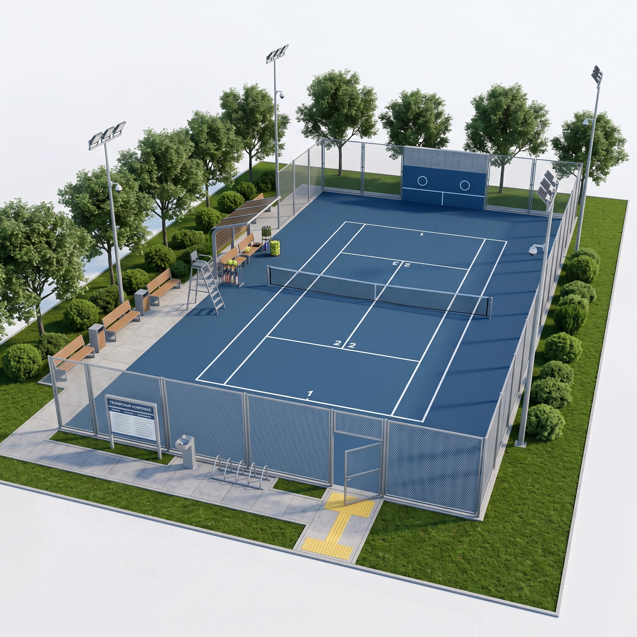 Открытые теннисные площадки в городской среде часто проектируются по остаточному принципу: разметку наносят на свободном куске асфальта, ставят сетку и считают задачу решённой. В результате игрок получает поверхность, на которой нельзя играть в плохую погоду, ограждение, через которое мячи вылетают на газон, и отсутствие любой инфраструктуры для тренировок и отдыха между геймами. Серьёзный любитель тенниса в такой площадке не задерживается, а клубная активность вокруг неё не складывается. В этом проекте корт собран как полноценный спортивный модуль. Игровое поле выполнено с акриловым покрытием синего цвета и точной разметкой по стандартам ITF — на нём можно проводить и одиночные, и парные матчи. Тренировочная стенка с отбойной разметкой за торцевой линией даёт возможность отрабатывать удары без партнёра, что особенно важно для одиночных тренировок и разминки. Судейская вышка и расширенная зона отдыха со скамьями, навесом, стойкой для ракеток и корзинами для мячей превращают корт в место, где можно провести полноценную тренировочную сессию или любительский турнир со зрителями. Высокое сетчатое ограждение по периметру с увеличением до 4 метров за линиями подачи удерживает мячи внутри корта и защищает соседние зоны. Четыре мачты освещения по углам продлевают игровой день до позднего вечера. В результате теннисист получает площадку, на которой работает полный цикл игры — от индивидуальной разминки у стенки до парного матча с судьёй и зрителями. Клуб или муниципалитет получает корт, который не простаивает в межсезонье и собирает вокруг себя устойчивое сообщество игроков, а не остаётся бесхозным куском асфальта.