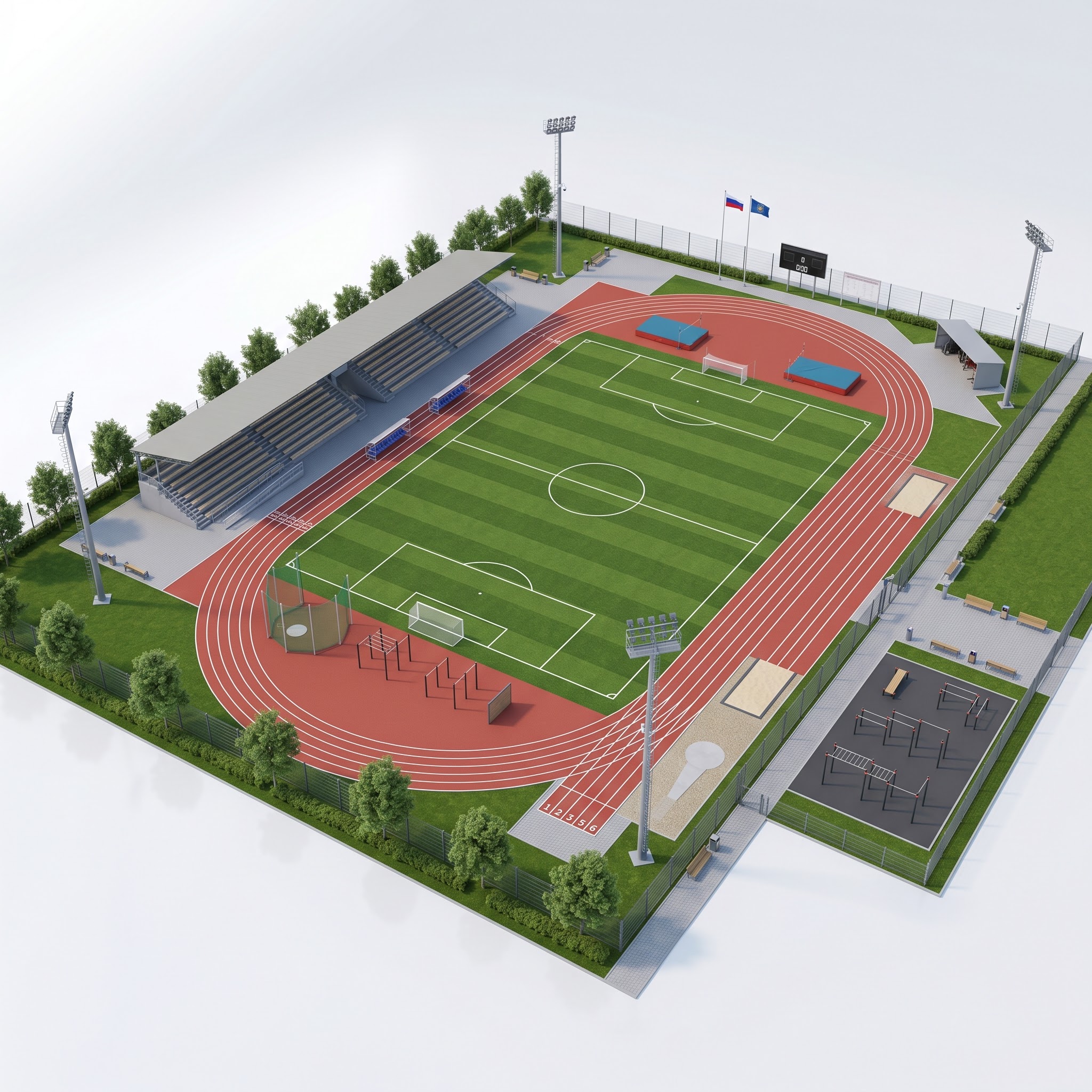 Стадион построен вокруг центрального футбольного поля и замкнутой беговой дорожки, что позволяет одновременно проводить тренировки по разным дисциплинам без пересечения потоков. Секторы прыжков и метаний вынесены за линию дорожки и сгруппированы по углам — это типовая схема легкоатлетических арен, удобная для учебных групп. Воркаут вынесен на отдельный участок, чтобы силовая подготовка не мешала основным занятиям. Трибуна с навесом обеспечивает проведение школьных соревнований при любой погоде, а полный комплект разметки и табло позволяет работать в формате официальных стартов.