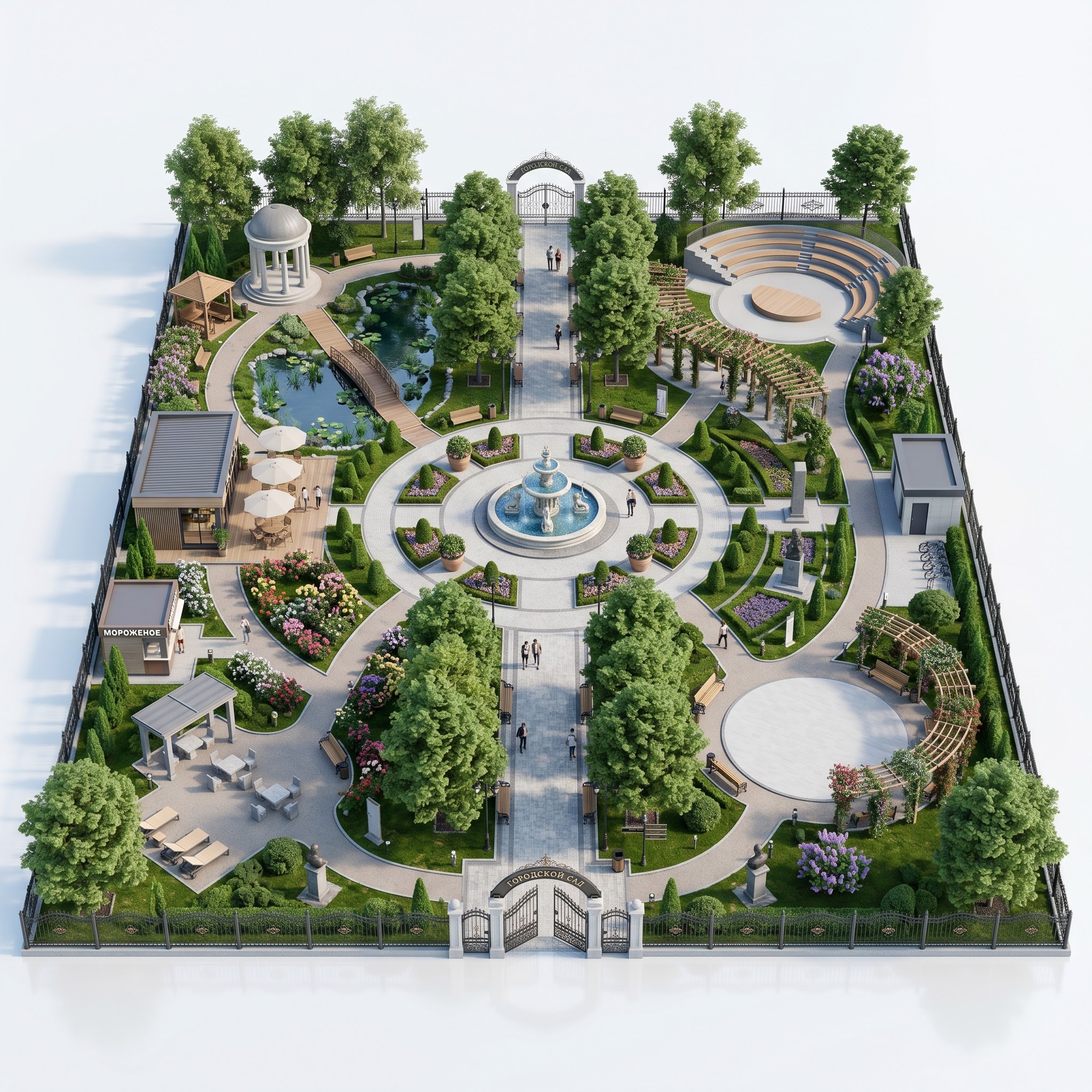 Парк построен на чёткой симметричной оси с фонтаном-доминантой и парадными воротами с обеих сторон — это даёт понятную навигацию и узнаваемый образ городского сада. Функции разнесены по четырём секторам так, чтобы тихий пруд и созерцательные зоны не пересекались с шумным амфитеатром и кафе. Кольцевые дорожки связывают все узлы без тупиков, а периметральная посадка крупномеров и кованое ограждение отделяют парк от городского шума и формируют замкнутый микроклимат сада.