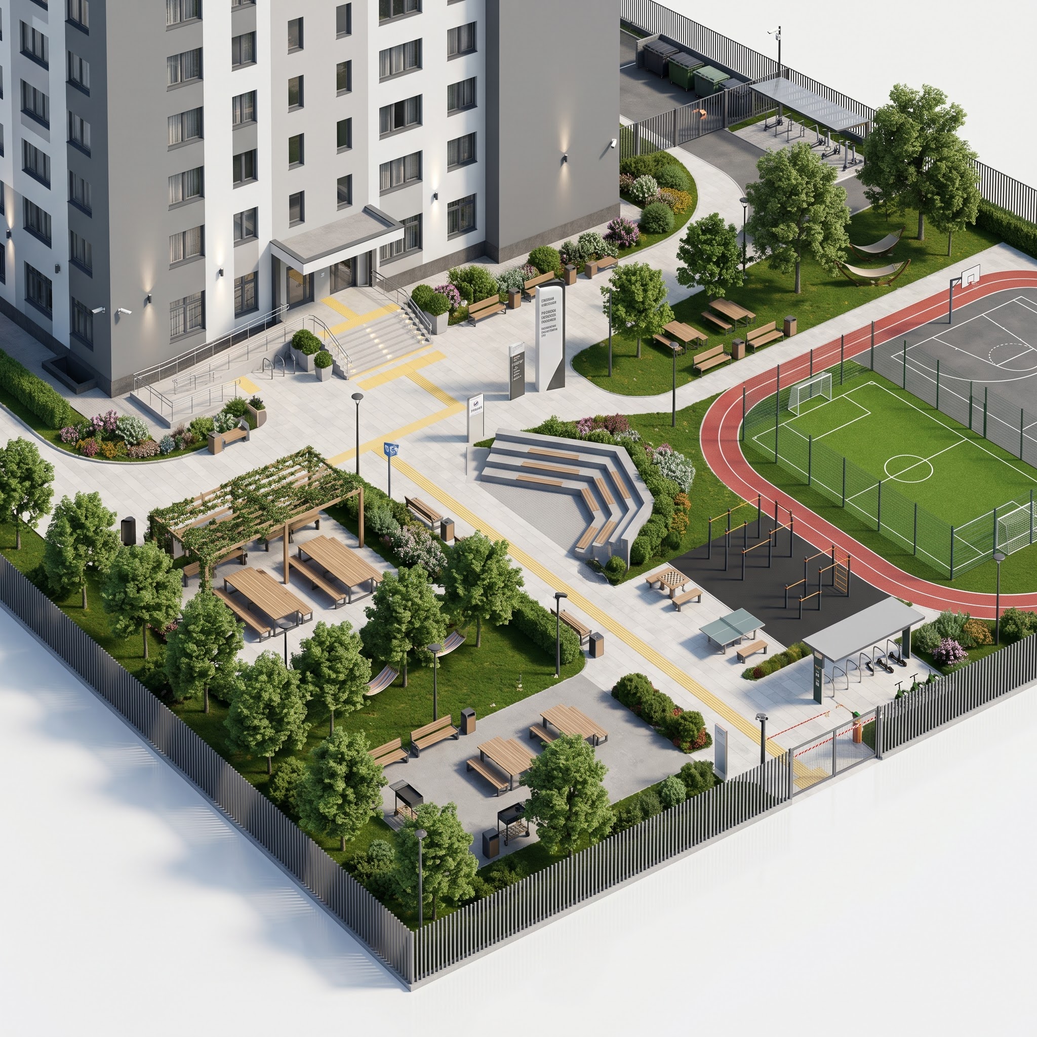 Типовой двор студенческого общежития обычно представляет собой парковку с парой скамеек и контейнерной площадкой. Студенты в таких условиях вынуждены покидать территорию ради любого сценария, выходящего за рамки сна и быта: спорт — в университетский комплекс, групповая подготовка — в библиотеку или кафе, отдых — куда получится. При плотности 200–500 человек на корпус это создаёт постоянный отток с территории и одновременно — шумовое давление на двор от стихийных компаний без инфраструктуры. Проект решает задачу через насыщение двора функциями, которые соответствуют реальному режиму студенческой жизни. Центральной осью территории становится пешеходная аллея с тактильной разметкой, связывающая вход в общежитие, амфитеатр и спортивное ядро. Амфитеатр работает как открытая аудитория на 60–80 человек: здесь проводят групповые занятия, читают конспекты перед сессией, собираются на студенческие мероприятия. Рядом — пергола с двумя длинными столами, рассчитанная на коллективную работу над проектами и совместный приём пищи; этот сценарий особенно важен в общежитии, где личного пространства мало. Спортивное ядро с футбольным полем, беговой дорожкой и баскетбольной площадкой закрывает запрос на ежедневную физическую активность без поездок в спорткомплекс. Воркаут и настольный теннис у торца здания — для коротких перерывов между парами. Тихая зона с гамаками под деревьями вынесена в дальний угол и работает на восстановление между нагрузками. В результате студент получает двор, в котором закрыты основные сценарии учебного дня: проснулся — пробежка по дорожке, после пар — групповая подготовка в перголе, вечером — игра в футбол или встреча с соседями в амфитеатре. Университет получает территорию, которая снижает нагрузку на собственную инфраструктуру и делает общежитие конкурентным аргументом при наборе абитуриентов.