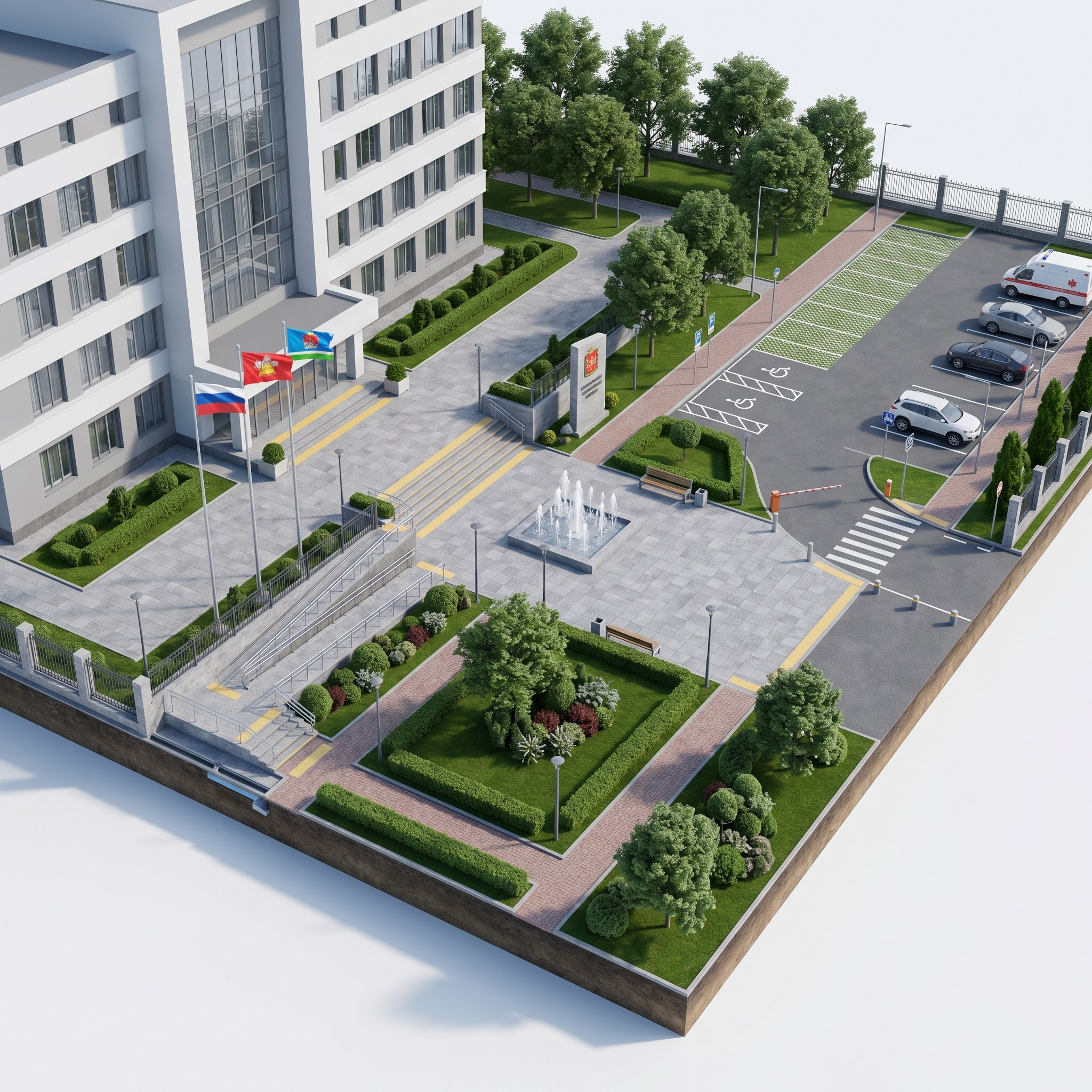 Проект решает три ключевые задачи административной территории: создаёт представительский образ ведомства через парадную ось с фонтаном и флагштоками, организует понятную и безопасную логистику для посетителей и служебного транспорта, обеспечивает полную доступность среды для маломобильных граждан. Парковка отделена от пешеходных потоков, имеет специализированные места и резерв для оперативного транспорта. Регулярная геометрия озеленения и качественное мощение задают деловой характер пространства, соответствующий статусу административного здания.