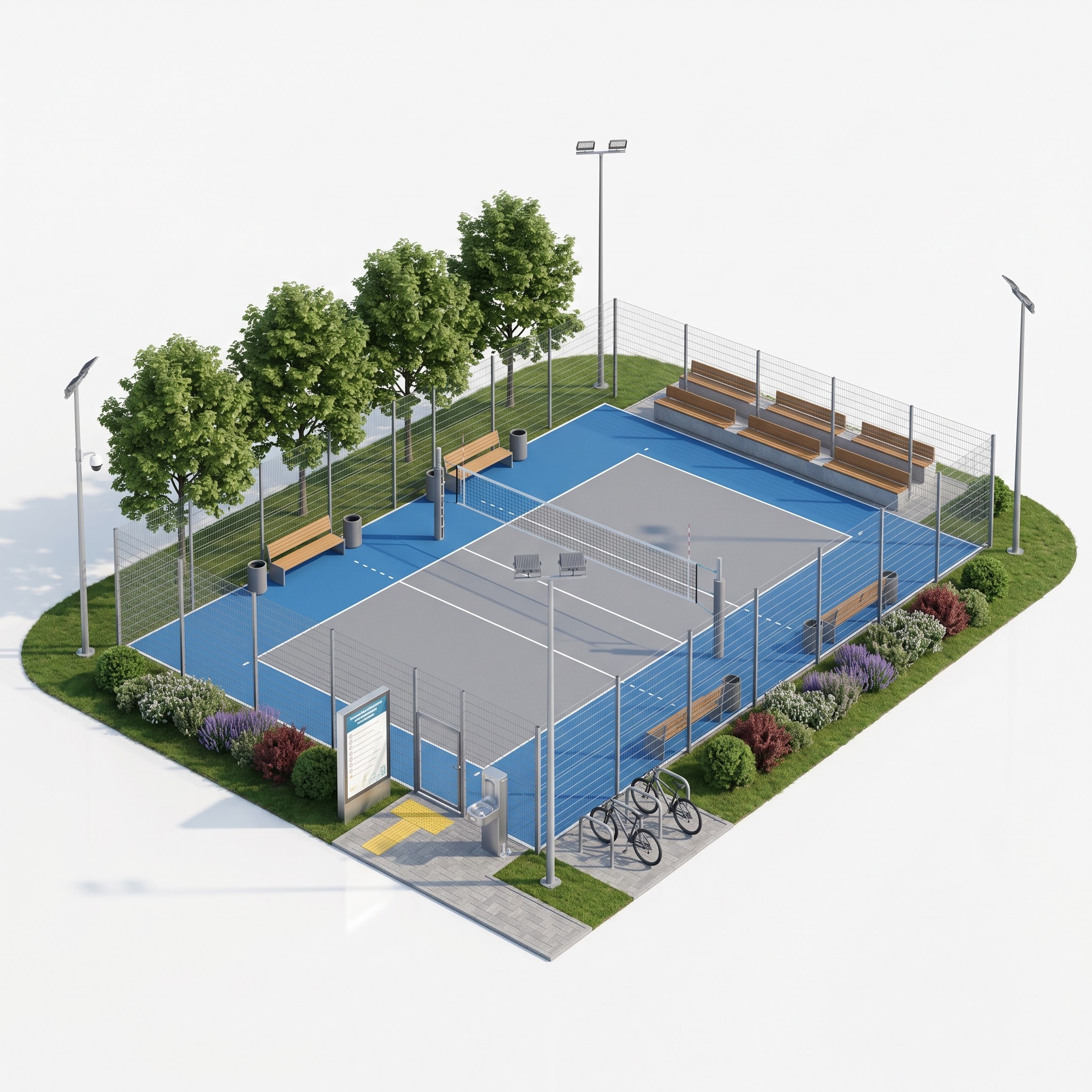 Большинство уличных волейбольных площадок в городах сводится к минимуму: сетка, разметка и ограждение. На таких объектах нельзя провести полноценный матч с зрителями, нет инфраструктуры ожидания, нет освещения для вечерних игр. В результате площадка работает несколько часов в день и только для случайных игр — соревновательная функция полностью выпадает, и любительские команды вынуждены искать платные залы или ехать в другие районы. Этот проект решает задачу через полный набор инфраструктуры на минимальной территории. Игровое поле выполнено с двухцветным резиновым покрытием и стандартной разметкой 9×18 м — то есть подходит не только для тренировок, но и для официальных любительских матчей. Вдоль длинной стороны установлены деревянные трибуны на 4 ряда — это место для зрителей, команд запаса и тренеров, без которого турнир не провести. С противоположной стороны размещены скамьи для разогрева и ожидания. Сетчатое ограждение высотой около 4 м удерживает мяч в пределах площадки, а мачтовое освещение с прожекторами обеспечивает игру после захода солнца. Входной узел с информационным стендом, питьевым фонтанчиком, тактильной плиткой и велопарковкой закрывает вопросы доступности и логистики. В итоге площадка работает как полноценный спортивный объект, а не как обычная «коробка». На ней можно проводить регулярные тренировки секций, любительские турниры с командами запаса и зрителями, вечерние игры жителей района. Отпадает необходимость арендовать зал для матчей и искать дополнительные места для зрителей — всё собрано в одном месте.