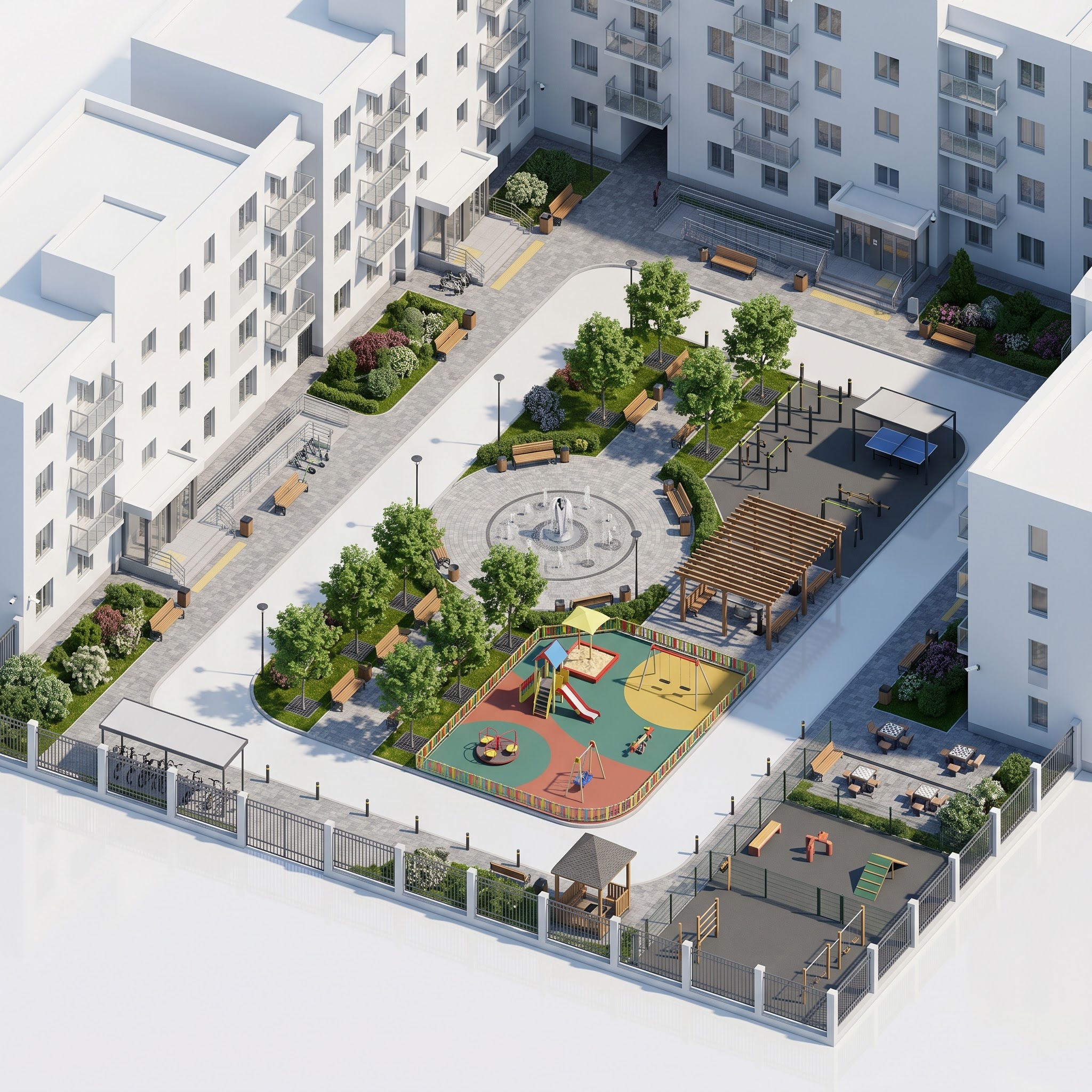 Типовой современный двор многоквартирного дома часто остаётся транзитной территорией: машины ставят вдоль подъездов, дети играют в случайных свободных пятнах, а старшее поколение почти не выходит, потому что не находит ни тени, ни компании. Жильцы из соседних подъездов годами не знакомы друг с другом, а площадка для собак выносится «куда-нибудь подальше» и превращается в зону конфликтов с гуляющими родителями. Этот проект решает задачу иначе — через сценарную организацию двора без машин. В центре двора расположена круглая площадь с пешеходным фонтаном — это смысловое ядро, к которому стягиваются все маршруты от подъездов. Слева от площади — детская игровая зона на мягком покрытии с горкой, песочницей и качелями, спроектированная так, чтобы она просматривалась с любой скамьи площади. Справа от площади — спортивно-рекреационная группа: воркаут-комплекс, столы для настольного тенниса и длинная пергола со скамьями, которая работает и как тень для тренирующихся, и как место для соседских разговоров. Вдоль фасадов организованы тихие узлы — палисадники со скамьями и столами для шахмат, в которые уходит старшее поколение. Площадка для дрессировки собак с навесом вынесена за основной контур и не пересекает детские маршруты. Велопарковка под навесом и стоянка самокатов размещены у въездных калиток. В результате жители получают двор, в котором не нужно никуда уезжать ради ежедневных сценариев: ребёнок играет в виду родителей, родители тренируются рядом с площадкой, бабушки и дедушки сидят за шахматами у своего подъезда, собаку выгуливают в той же территории, но не в общем потоке. Соседи начинают пересекаться у фонтана, у пергол, у входов с велопарковки — и двор превращается в маленькое сообщество.