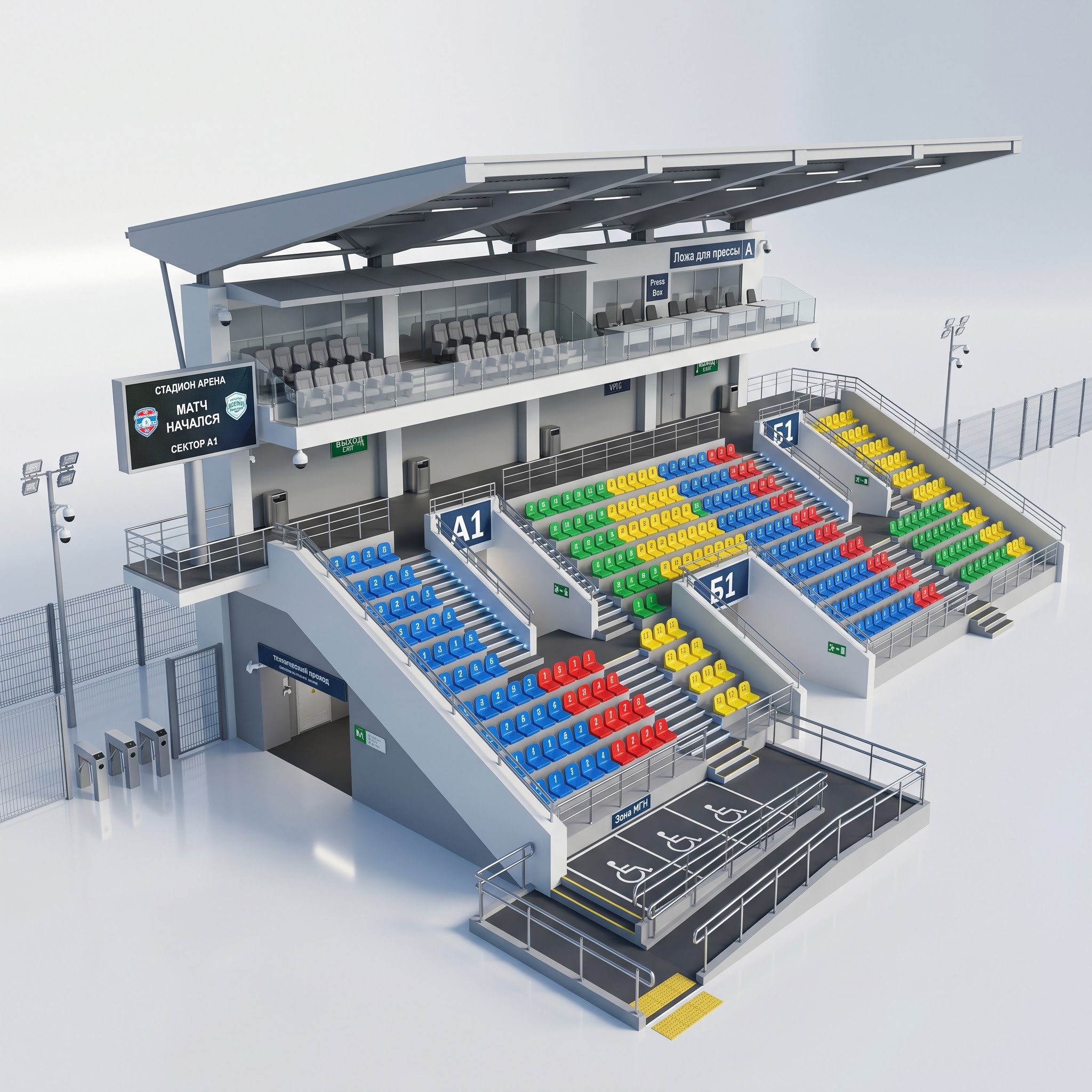 Стандартная типовая трибуна на спортивных объектах решает только одну задачу — посадить зрителей. На практике этого недостаточно: на матч одновременно приходят журналисты, представители клубов, рядовые болельщики, семьи с детьми и маломобильные гости. Если их потоки и места не разведены, организаторы каждый раз сталкиваются с одинаковыми проблемами — пресса мешает зрителям, VIP не имеют отдельной зоны, маломобильным гостям просто негде разместиться. Этот проект решает задачу через чёткое функциональное зонирование внутри одной компактной конструкции. Верхний ярус закрыт под пресс-ложу и VIP-зону: остеклённый объём с собственными креслами, рабочими столами для журналистов и отдельным выходом обеспечивает работу с трансляцией и приём официальных гостей. Нижний ярус — основная зрительская чаша с цветовой кодировкой секторов А1 и Б1, где номера мест и цвет кресел делают рассадку очевидной без сопровождающих. Зона МГН вынесена на уровень поля, оборудована пандусом, тактильной плиткой и собственными местами для колясок — маломобильный зритель попадает на трибуну без подъёма по лестницам. Входная группа с турникетами, технический проход для обслуживания и информационное табло с указанием сектора замыкают контур: каждый зритель проходит свой маршрут от ворот до места без пересечения с чужими потоками. В результате клуб или муниципальный объект получает трибуну, которая работает не только во время матча, но и при медиамероприятиях, церемониях награждения, школьных соревнованиях. Уходит необходимость арендовать дополнительные конструкции под прессу или организовывать отдельные места для МГН в день события — все режимы заложены в проект изначально.